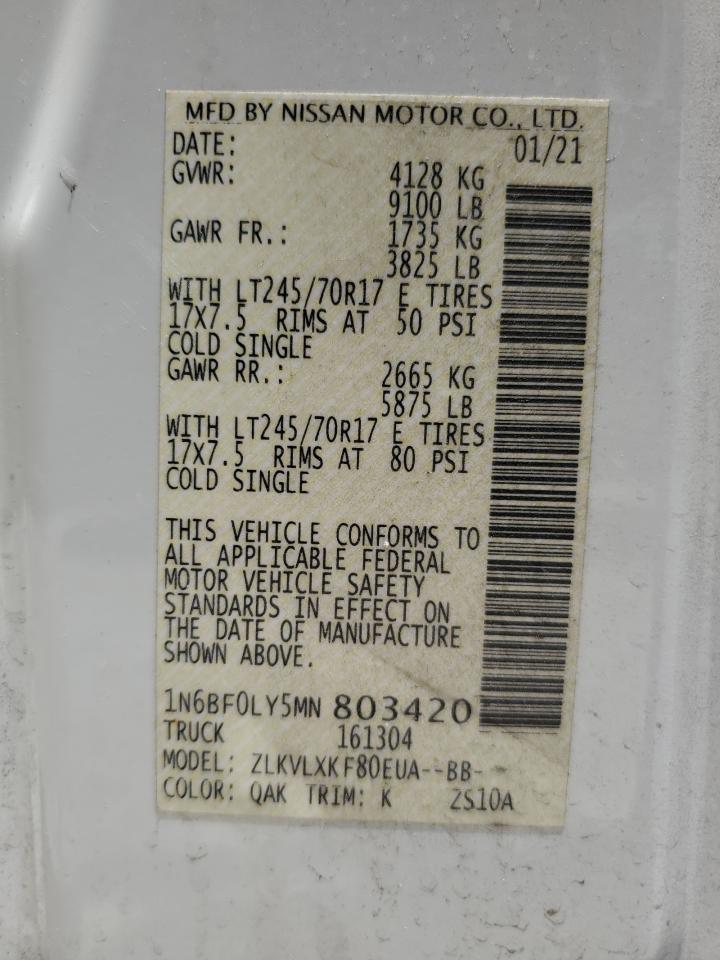 2021 NISSAN NV2500 - 1N6BF0LY5MN803420, колір - Білий, 4.0, Бензин, Задній привід із США