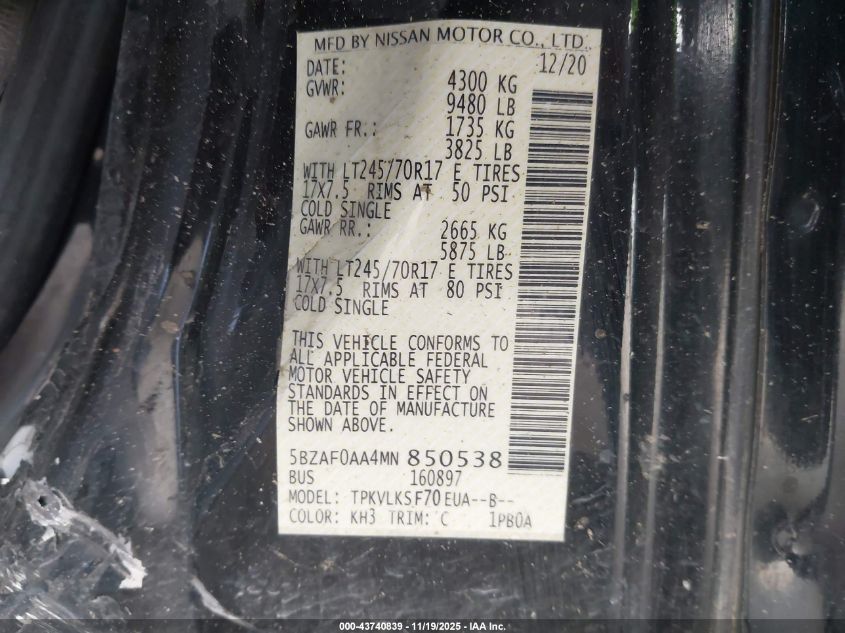 2021 NISSAN NV3500 - 5BZAF0AA4MN850538, колір - Чорний, 5.6, Бензин, Задній привід із США