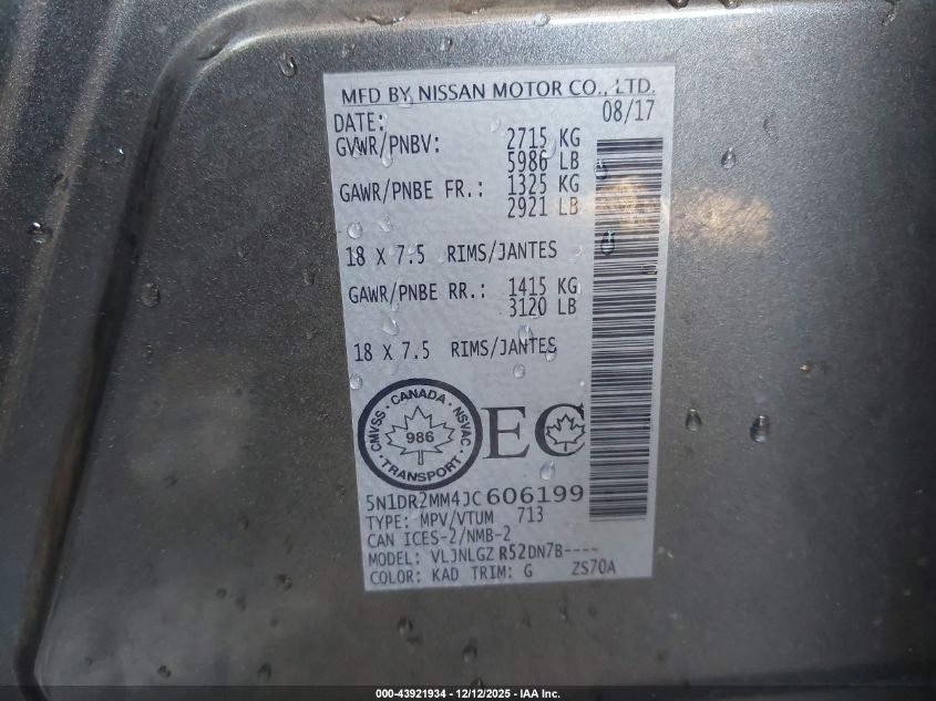 Колір СірийЦиліндри 6Привід Повний привідVIN 5N1DR2MM4JC606199Стан Заводиться та їде (перевірено)Ушкодження З боків