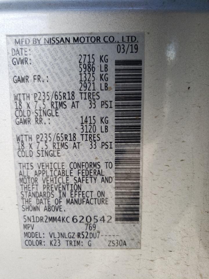 2019 NISSAN PATHFINDER - 5N1DR2MM4KC620542, колір - Срібний, 3.5, Бензин, 4x4 з переднім приводом із США