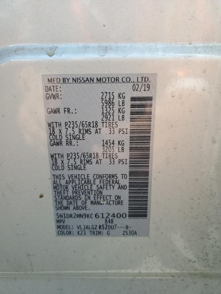 Колір СрібнийЦиліндри 6VIN 5N1DR2MN9KC612400Стан Заводиться та їде (перевірено)Ушкодження НезначніДата аукціона 2025-10-06