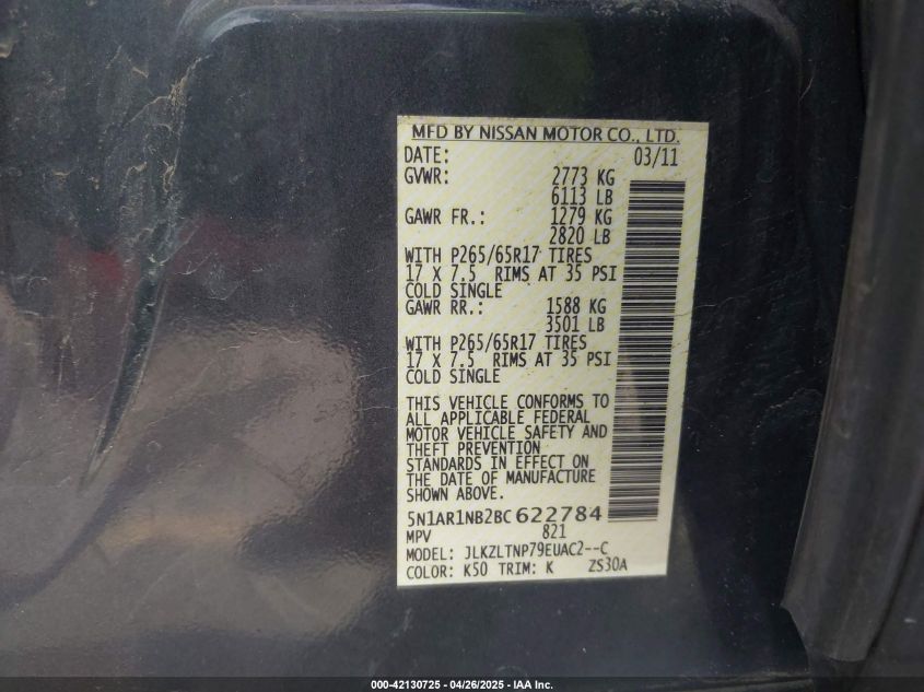 2011 NISSAN PATHFINDER - 5N1AR1NB2BC622784, колір - Сірий, 4.0, Бензин, Повний привід із США
