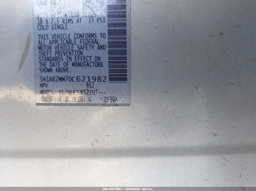 Колір СрібнийЦиліндри 6Привід Повний привідVIN 5N1AR2MM7DC621982Стан Заводиться та їде (перевірено)Ушкодження Передня або задня