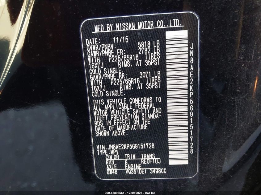 2016 NISSAN QUEST S