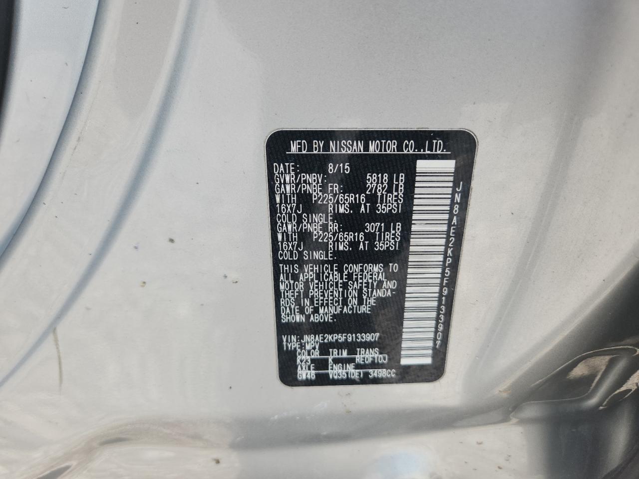 2015 NISSAN QUEST - JN8AE2KP5F9133907, колір - Срібний, 3.5, Бензин, із США