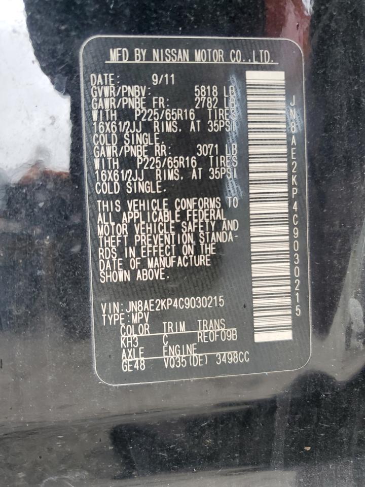2012 NISSAN QUEST - JN8AE2KP4C9030215, колір - Чорний, 3.5, Бензин, із США