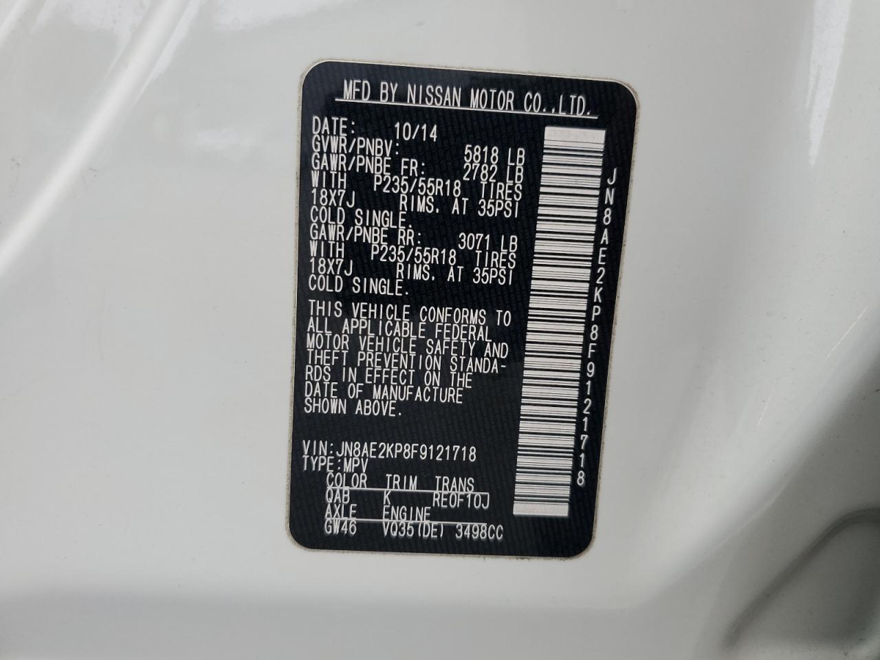 Колір БілийЦиліндри 6VIN JN8AE2KP8F9121718Стан Заводиться та їде (перевірено)Ушкодження Задня