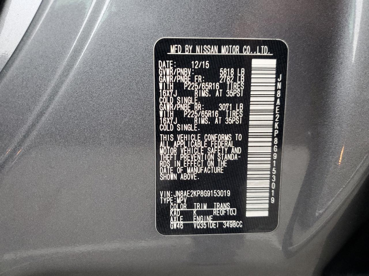 Колір СірийЦиліндри 6VIN JN8AE2KP8G9153019Стан Заводиться та їде (перевірено)Ушкодження Передня або задня