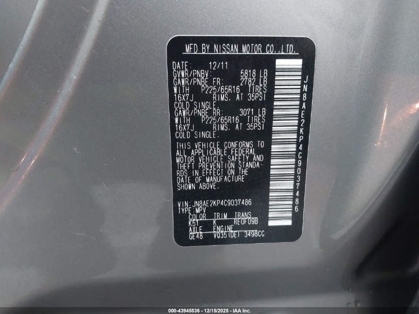 2012 NISSAN QUEST - JN8AE2KP4C9037486, колір - Сірий, 3.5, Бензин, Передній привід із США