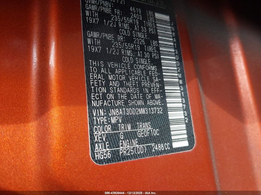 2021 NISSAN ROGUE - JN8AT3DD2MW313732, колір - Апельсиновий, 2.5, Бензин, Повний привід із США