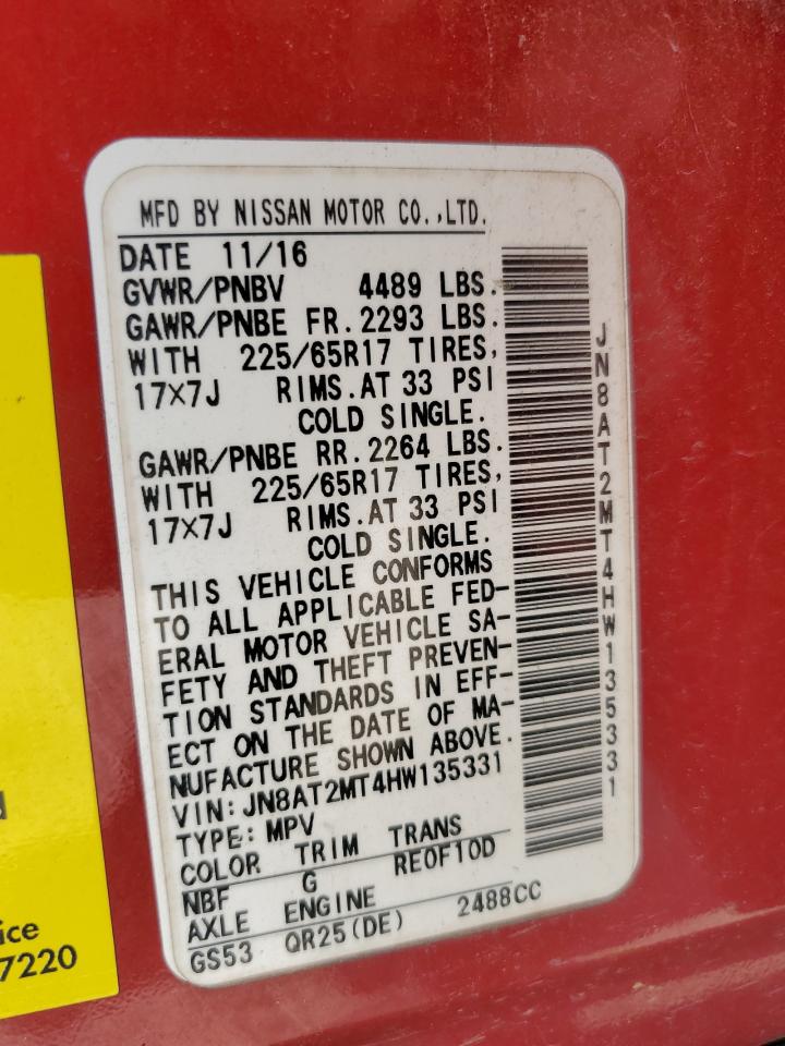 2017 NISSAN ROGUE - JN8AT2MT4HW135331, колір - Червоний, 2.5, Бензин, із США