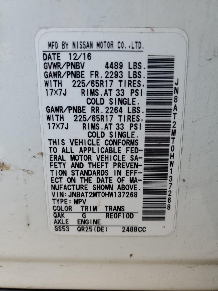 2017 NISSAN ROGUE - JN8AT2MT0HW137268, колір - Білий, 2.5, Бензин, із США