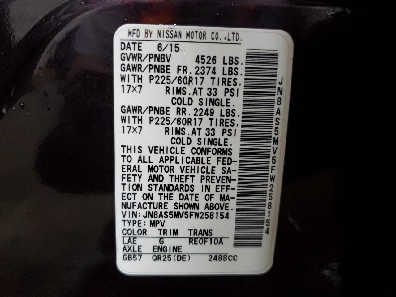 Колір ФіолетовийЦиліндри 4Привід Повний привідVIN JN8AS5MV5FW258154Стан Заводиться та їде (перевірено)Ушкодження Передня або задня