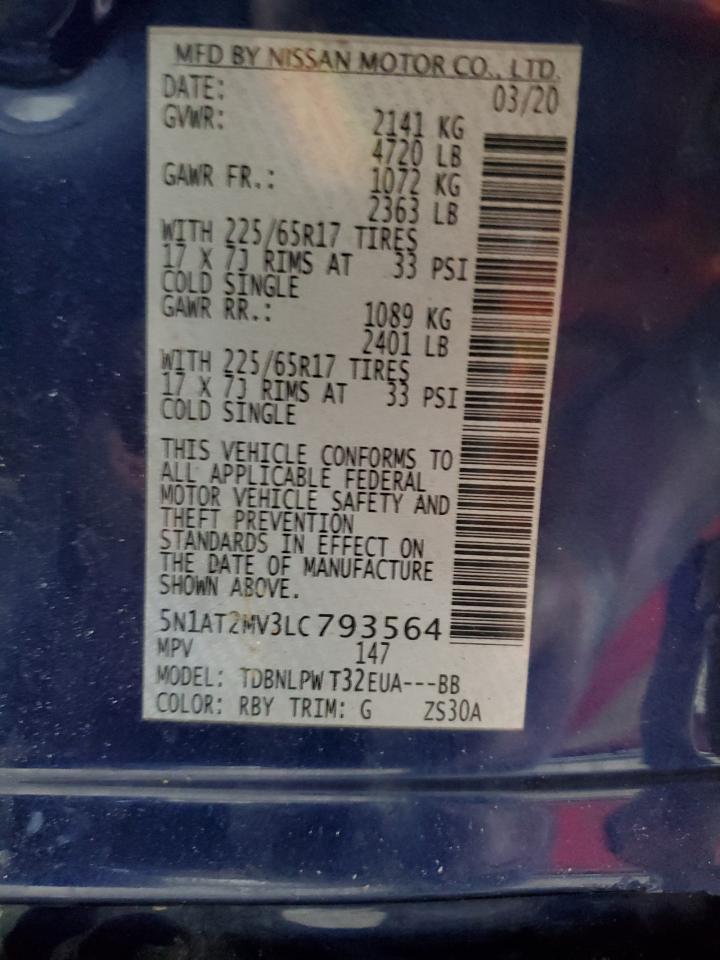 2020 NISSAN ROGUE - 5N1AT2MV3LC793564, колір - Синій, 2.5, Бензин, Повний привід із США