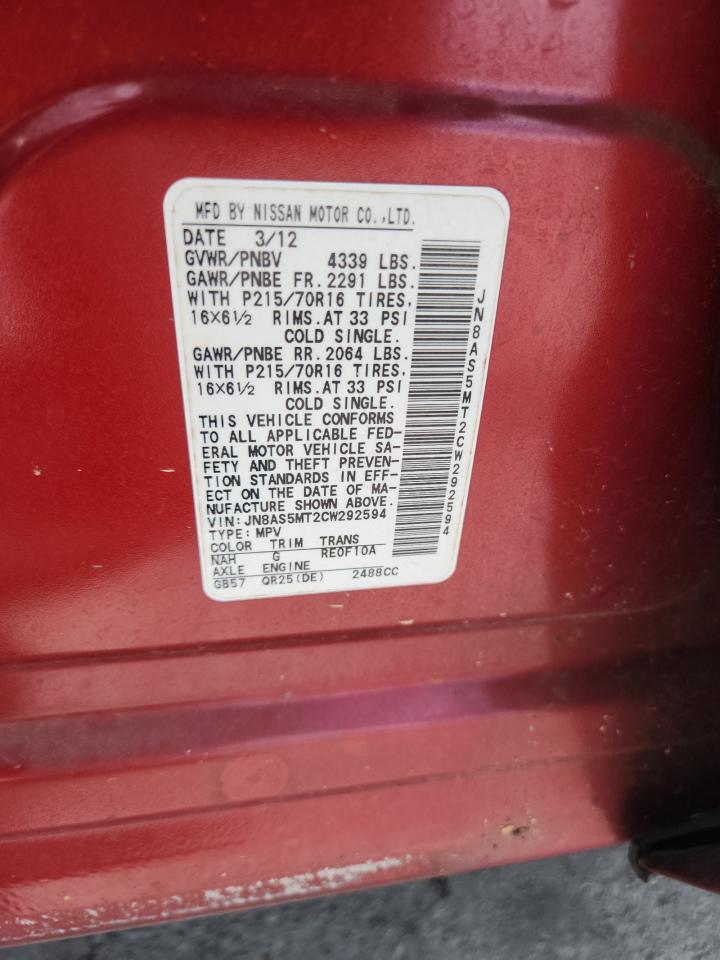 2012 NISSAN ROGUE - JN8AS5MT2CW292594, колір - Червоний, 2.5, Бензин, із США