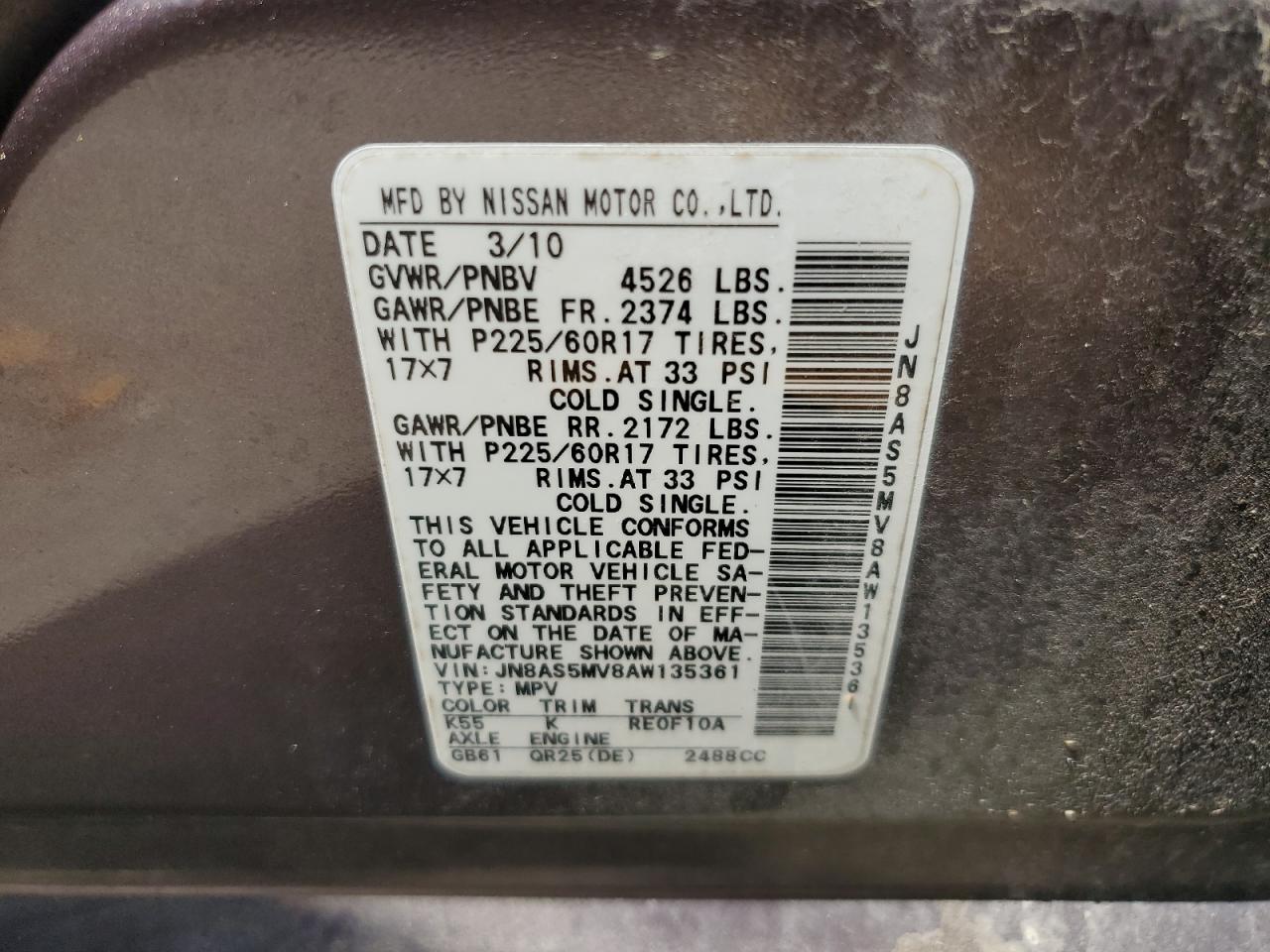 2010 NISSAN ROGUE - JN8AS5MV8AW135361, колір - Сірий, 2.5, Бензин, Повний привід із США