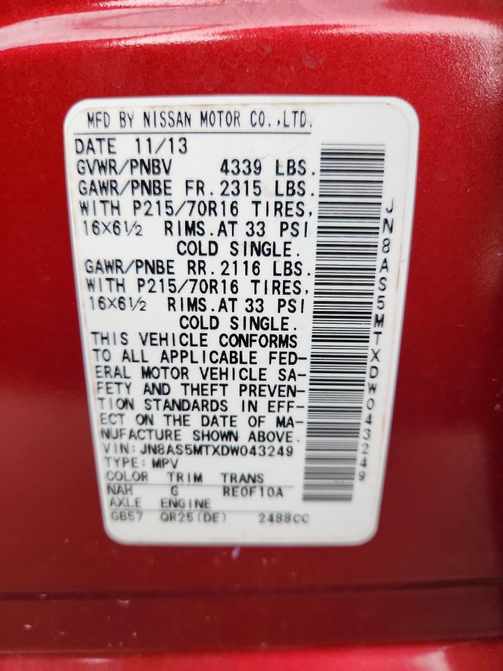 2013 NISSAN ROGUE - JN8AS5MTXDW043249, колір - Червоний, 2.5, Бензин, із США