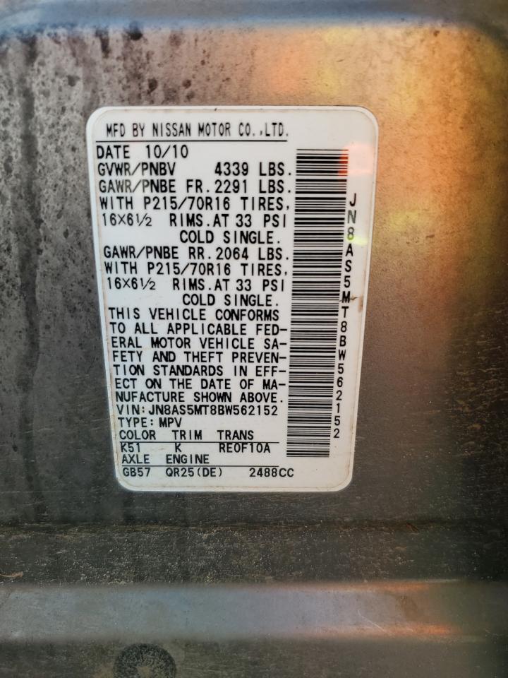 2011 NISSAN ROGUE - JN8AS5MT8BW562152, колір - Срібний, 2.5, Бензин, із США