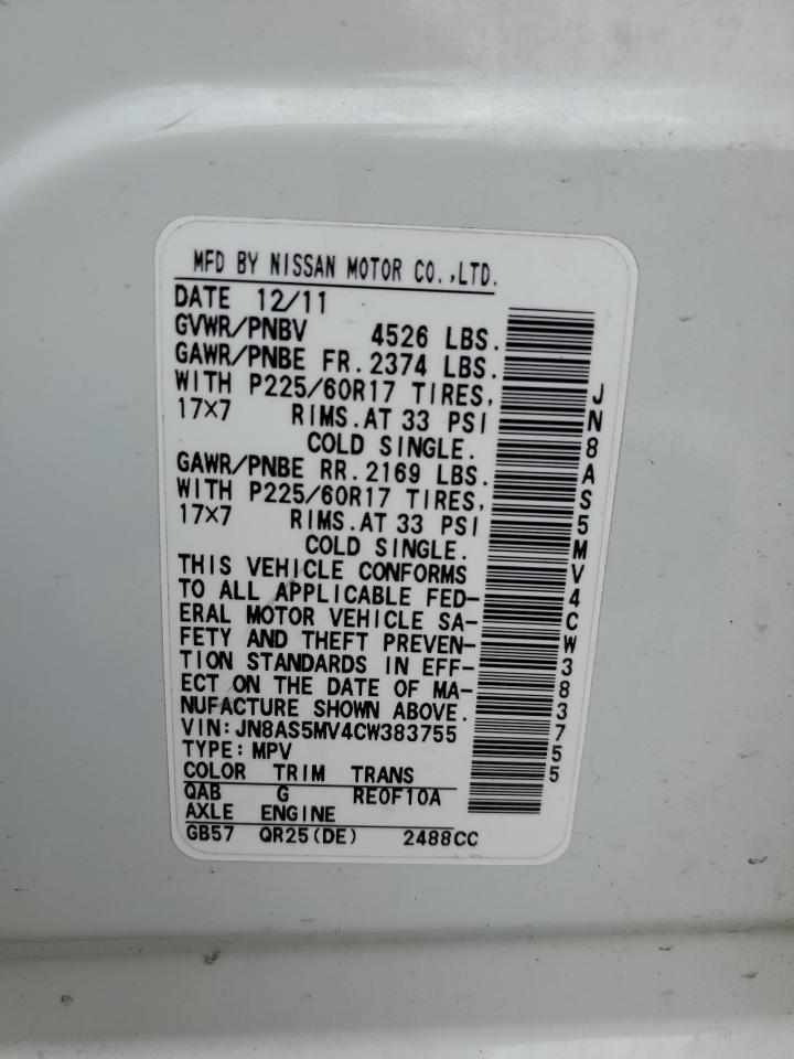 2012 NISSAN ROGUE - JN8AS5MV4CW383755, колір - Білий, 2.5, Бензин, Повний привід із США