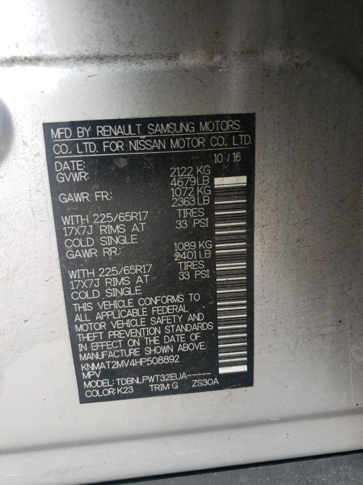 Колір СрібнийЦиліндри 4Привід Повний привідVIN KNMAT2MV4HP508892Стан Заводиться та їде (перевірено)Ушкодження Передня або задня