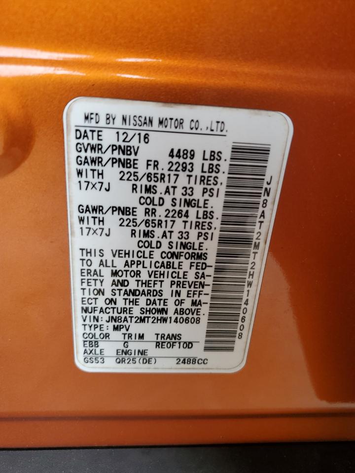 2017 NISSAN ROGUE - JN8AT2MT2HW140608, колір - Апельсиновий, 2.5, Бензин, із США