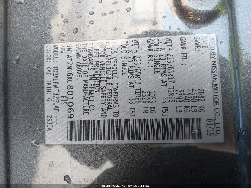2019 NISSAN ROGUE - 5N1AT2MT6KC801069, колір - Сірий, 2.5, Бензин, Передній привід із США