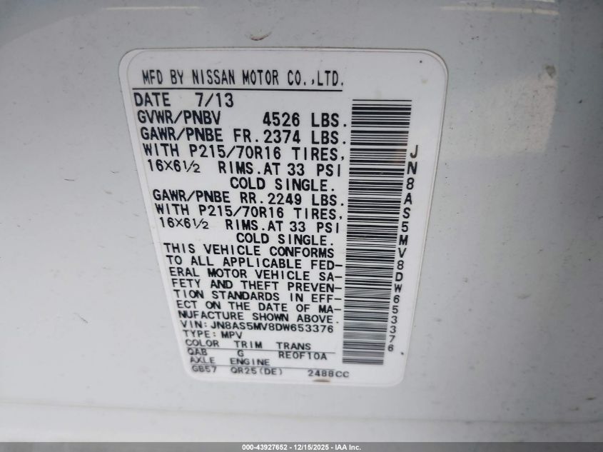 2013 NISSAN ROGUE - JN8AS5MV8DW653376, колір - Білий, 2.5, Бензин, Повний привід із США