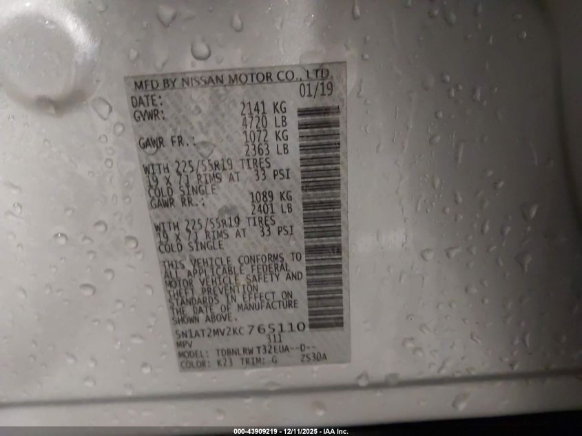 2019 NISSAN ROGUE - 5N1AT2MV2KC765110, колір - Срібний, 2.5, Бензин, Повний привід із США