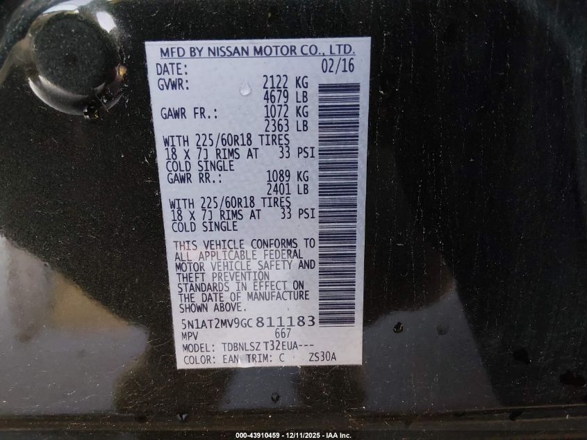 2016 NISSAN ROGUE - 5N1AT2MV9GC811183, колір - Чорний, 2.5, Бензин, Повний привід із США