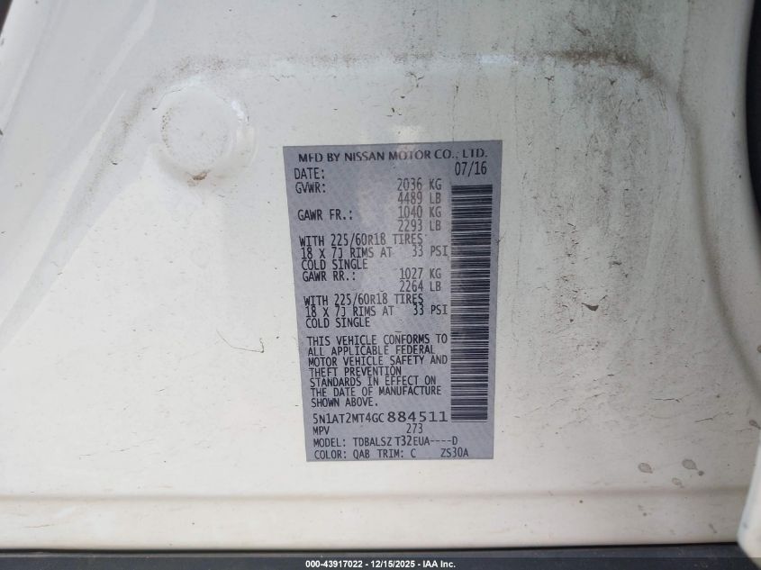 2016 NISSAN ROGUE - 5N1AT2MT4GC884511, колір - Білий, 2.5, Бензин, Передній привід із США