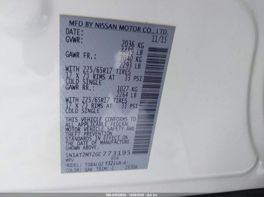 2016 NISSAN ROGUE - 5N1AT2MT2GC773195, колір - Білий, 2.5, Бензин, Передній привід із США