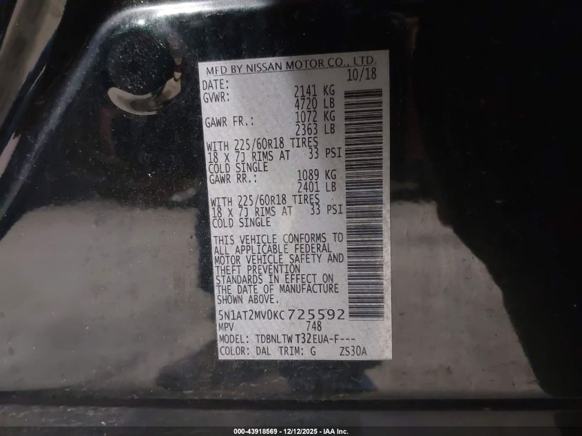 2019 NISSAN ROGUE - 5N1AT2MV0KC725592, колір - Зелений, 2.5, Бензин, Повний привід із США