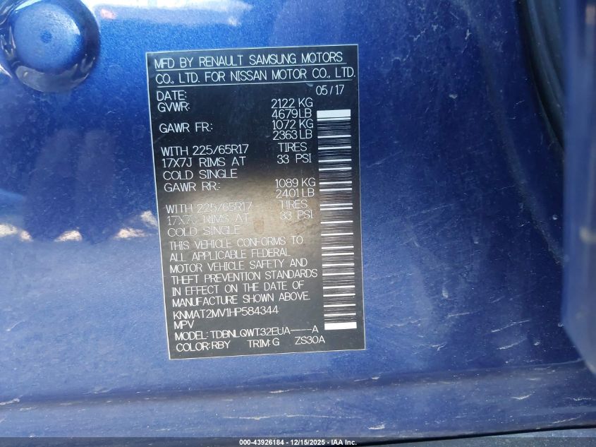 2017 NISSAN ROGUE - KNMAT2MV1HP584344, колір - Синій, 2.5, Бензин, Повний привід із США