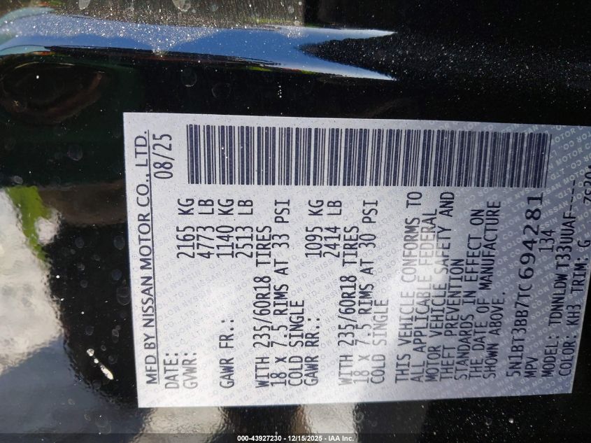 Колір ЧорнийЦиліндри 3Привід Повний привідVIN 5N1BT3BB7TC694281Стан СтаціонарноУшкодження Передня або задня