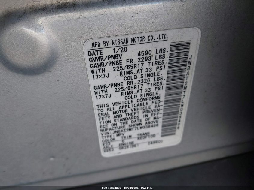 2020 NISSAN ROGUE - JN8AT2MT7LW038486, колір - Срібний, 2.5, Бензин, Передній привід із США