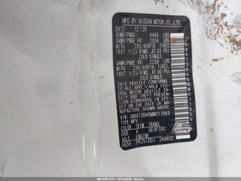 2021 NISSAN ROGUE - JN8AT3BA8MW011869, колір - Білий, 2.5, Бензин, Передній привід із США