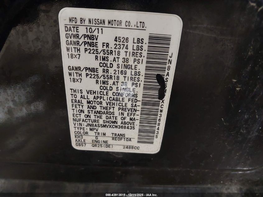 2012 NISSAN ROGUE - JN8AS5MVXCW368435, колір - Чорний, 2.5, Бензин, Повний привід із США