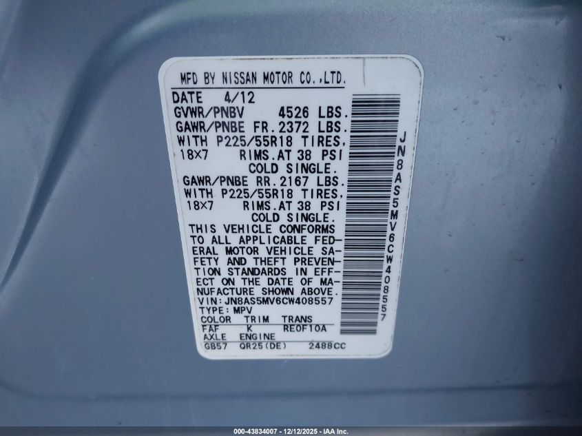 2012 NISSAN ROGUE - JN8AS5MV6CW408557, колір - Срібний, 2.5, Бензин, Повний привід із США