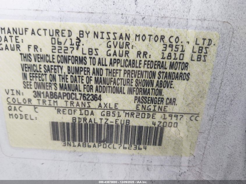 2012 NISSAN SENTRA - 3N1AB6AP0CL762364, колір - Білий, 2.0, Бензин, Передній привід із США