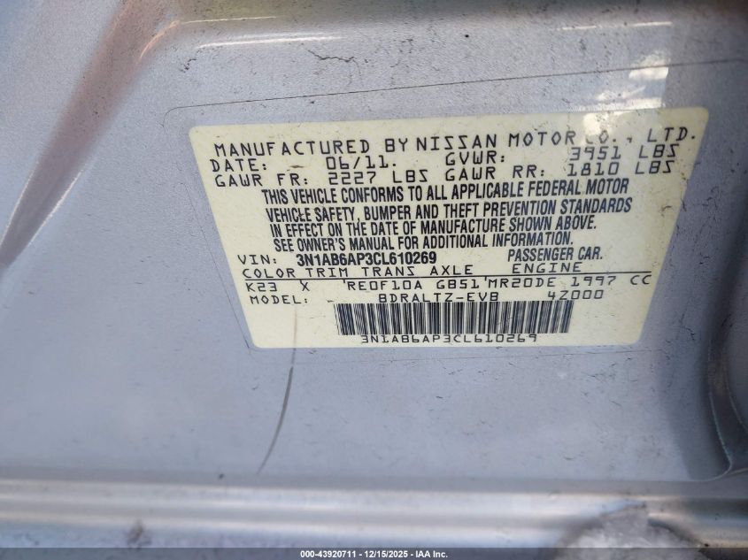 2012 NISSAN SENTRA - 3N1AB6AP3CL610269, колір - Срібний, 2.0, Бензин, Передній привід із США