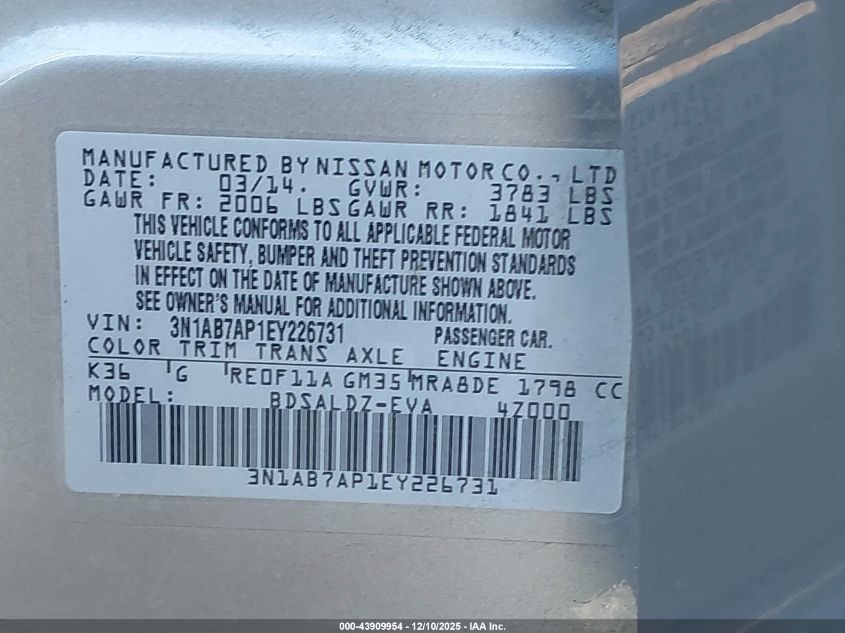 Колір СірийЦиліндри 4Привід Передній привідVIN 3N1AB7AP1EY226731Стан СтаціонарноУшкодження Передня і задня