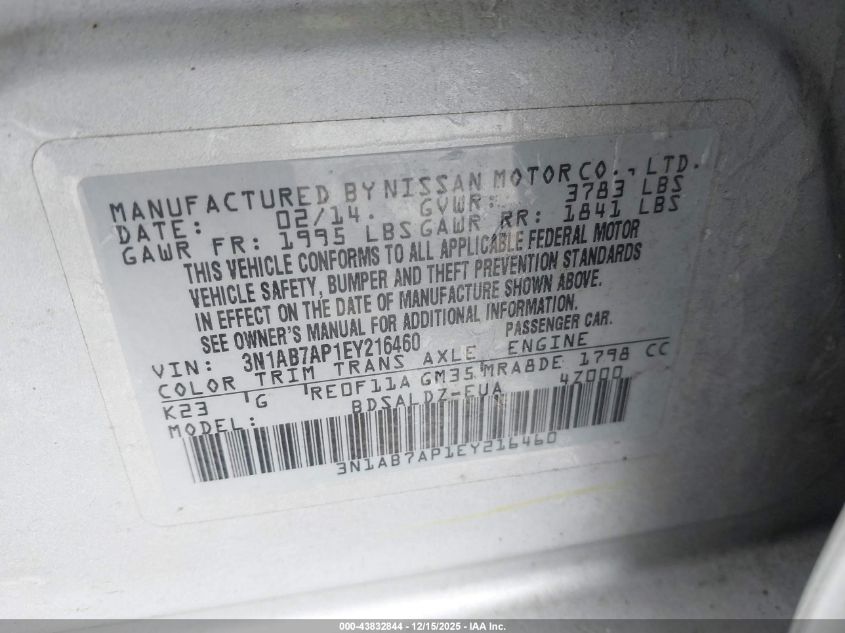 2014 NISSAN SENTRA - 3N1AB7AP1EY216460, колір - Срібний, 1.8, Бензин, Передній привід із США