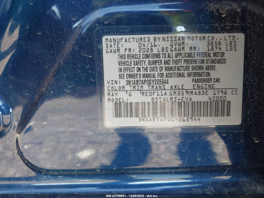 2016 NISSAN SENTRA - 3N1AB7AP0GY265944, колір - Фіолетовий, 1.8, Бензин, Передній привід із США