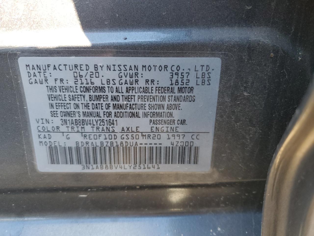 2020 NISSAN SENTRA - 3N1AB8BV4LY251641, колір - Срібний, 2.0, Бензин, із США