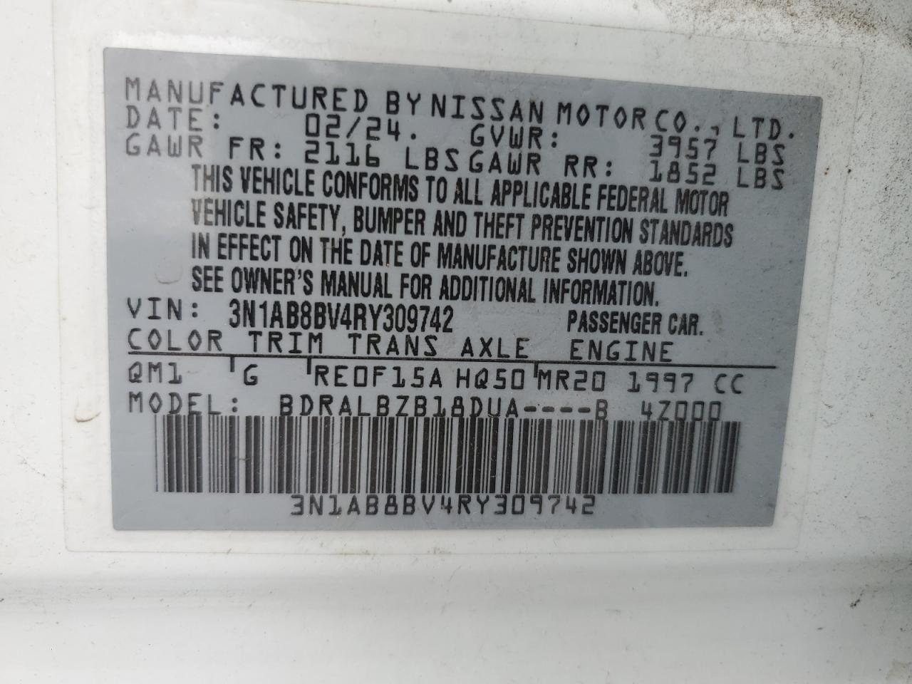 2024 NISSAN SENTRA - 3N1AB8BV4RY309742, колір - Білий, 2.0, Бензин, із США