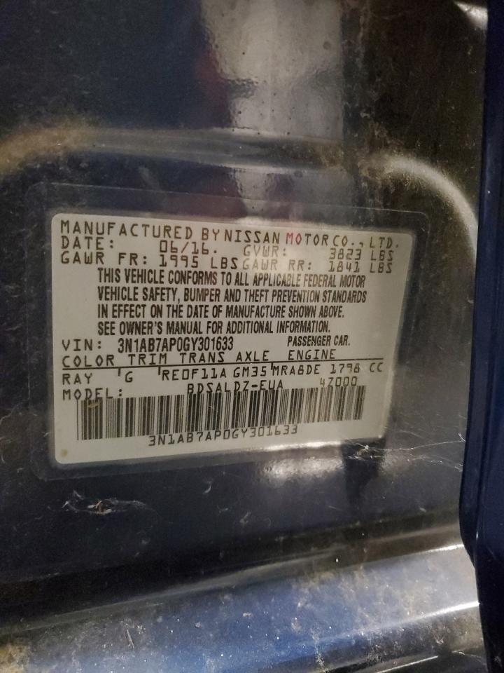 2016 NISSAN SENTRA - 3N1AB7AP0GY301633, колір - Синій, 1.8, Бензин, із США