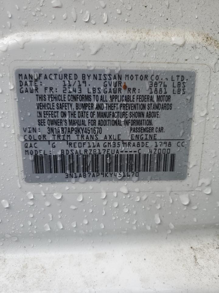 2019 NISSAN SENTRA - 3N1AB7AP9KY451670, колір - Білий, 1.8, Бензин, із США