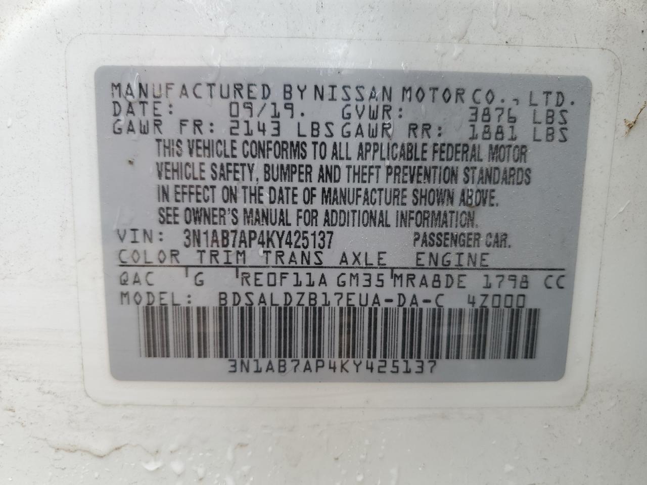 2019 NISSAN SENTRA - 3N1AB7AP4KY425137, колір - Білий, 1.8, Бензин, із США