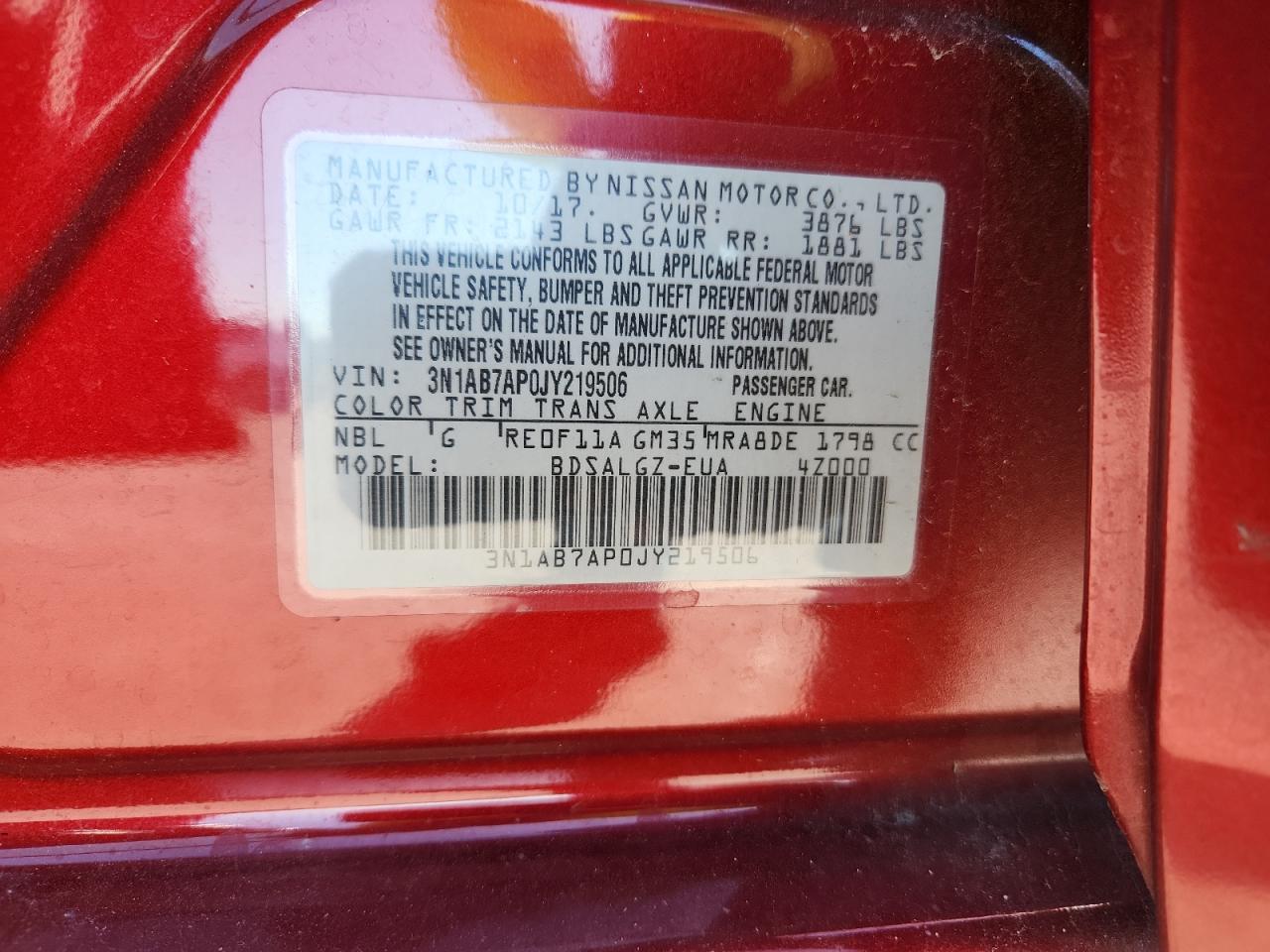 Колір ЧервонийЦиліндри 4VIN 3N1AB7AP0JY219506Стан НевідомоУшкодження Передня або задня