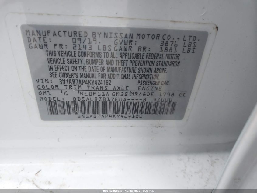 2019 NISSAN SENTRA - 3N1AB7AP4KY424182, колір - Білий, 1.8, Бензин, Передній привід із США